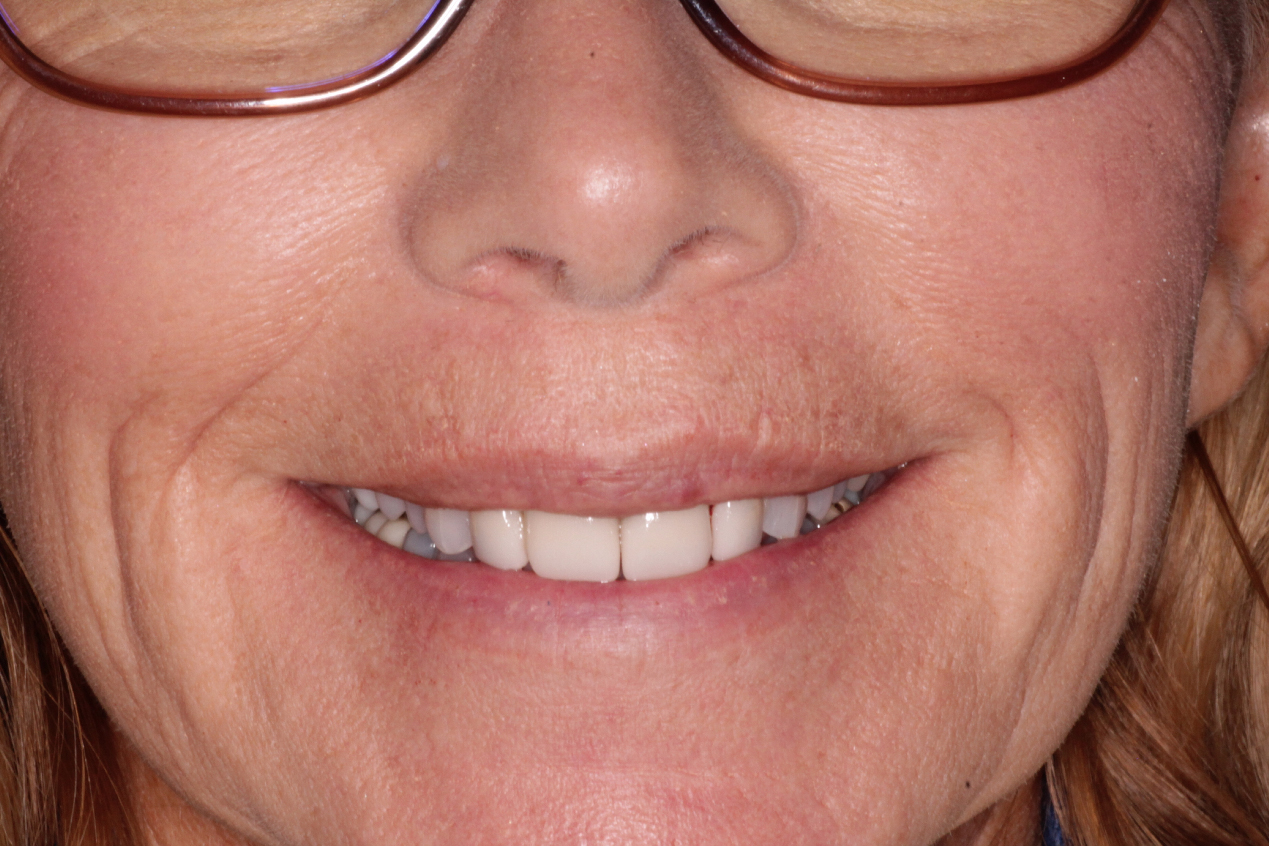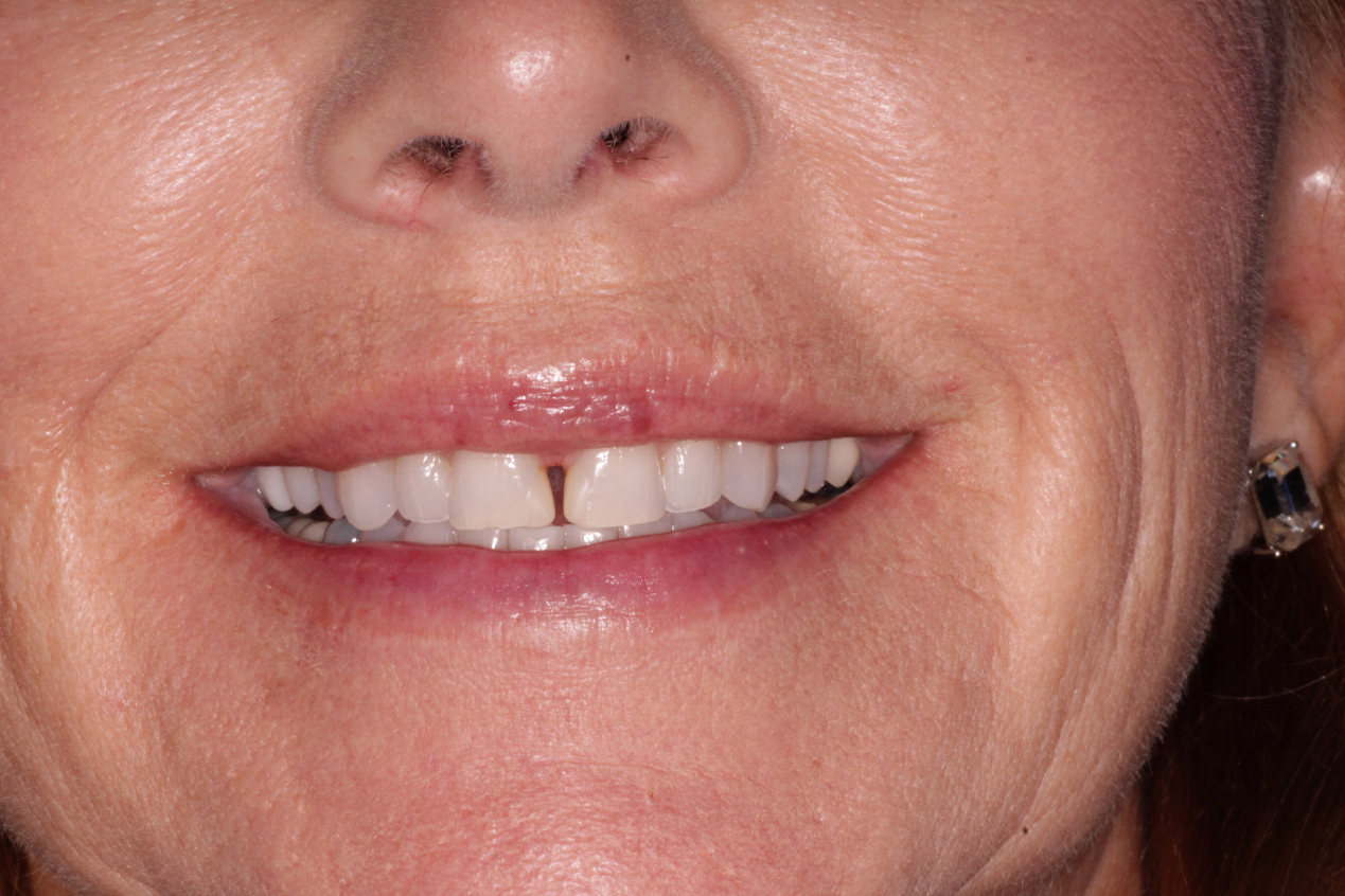 Treatment consisted of closing a gap between the front teeth using four veneers.